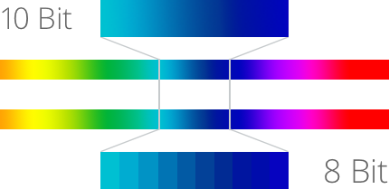 Pour obtenir la meilleure qualité d'image, les opérations de traitement vidéo telles que la mise à l'échelle des images, la correction colorimétrique, le compositing et les autres effets doivent être traités au moyen de la précision 10 bits. La raison pour cela est que lorsque vous manipulez de la vidéo avec de la précision 8 bits, à chaque fois que vous faites un rendu ou que vous modifiez l'image, la précision peut être réduite à 8 bits, ce qui peut provoquer de la postérisation et autres artéfacts indésirables. Avec le traitement d'image 10 bits, vous obtenez une résolution couleur quatre fois supérieure, ce qui procure des images de bien meilleure qualité.